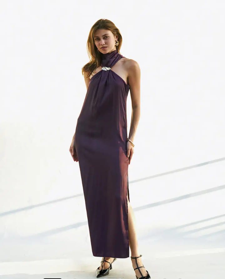 SATEN UZUN YIRTMAÇLI ELBİSE